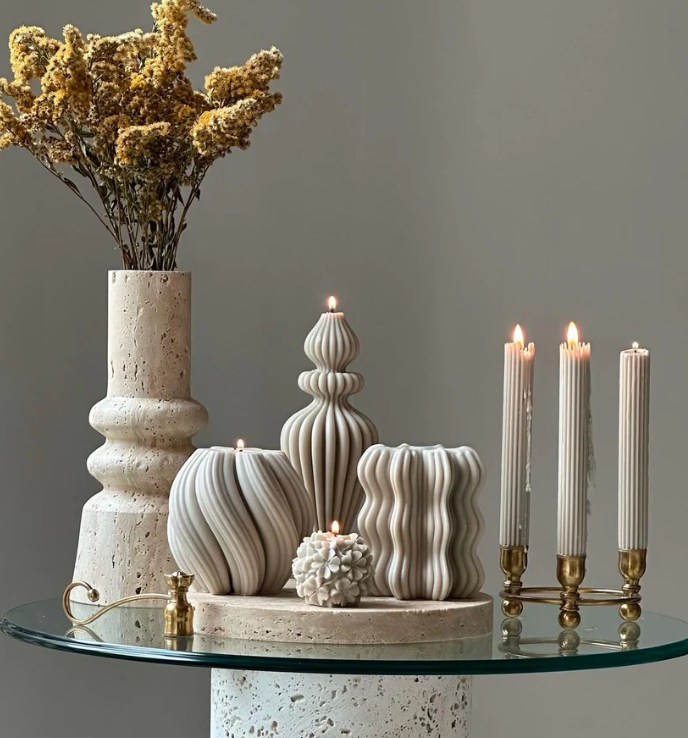 Yuvarlak Dalga model 1 Adet +Marko Vazo model 1 Adet +Dalga model 1 Adet +Şamdanlık Mum 3 Adet + Gül 1 Adet Toplam 7 Parça